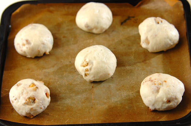 成形をする。15cmほどにのばし、<あん>をのせて包み、天板に並べる。天板を温かいところにおき、生地が一回り大きく膨らむまで二次発酵させる(30~40分)。
