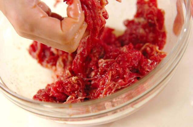 牛肉は幅3cmに切って、合わせた<調味料>と混ぜ合わせる。