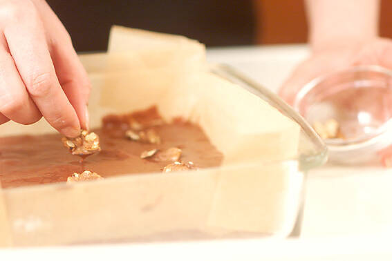 オーブンシートを敷いた型に流し入れ、生地をならす。間隔をあけて表面にクルミを並べる。