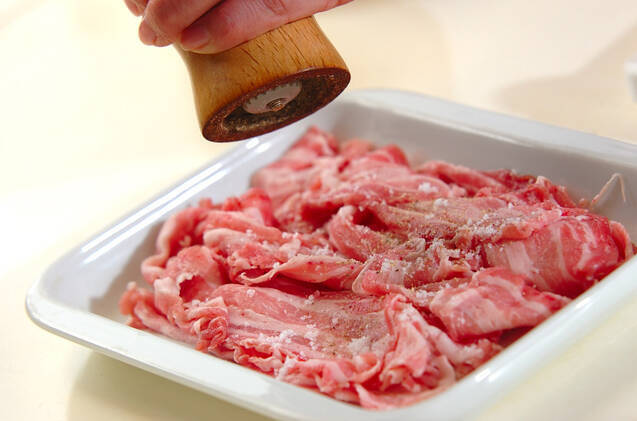 豚肉は半分に切り、塩コショウを振る。
