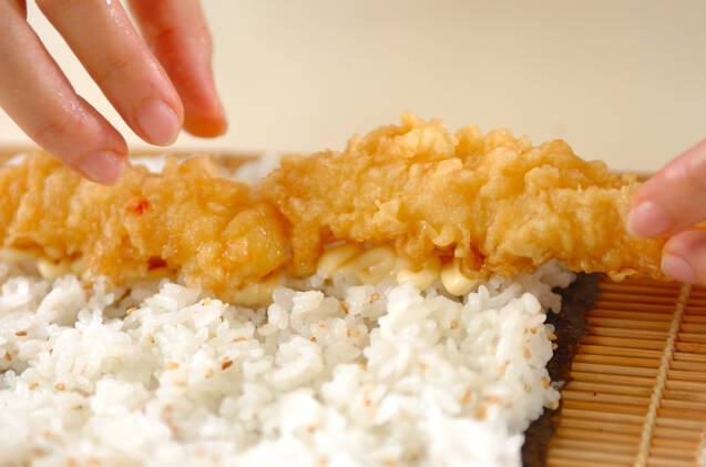 巻きすの上に焼きのりを置き、手前1cm、向こう側2cmをあけ、すし飯を広げる。ご飯の上にマヨネーズをぬり、(2)のエビの天ぷらをのせ、エビの天ぷらを押さえるようにして、巻きすごと転がすように巻き込み、そのまま軽く押さえて形を整える。食べやすい大きさに切る。