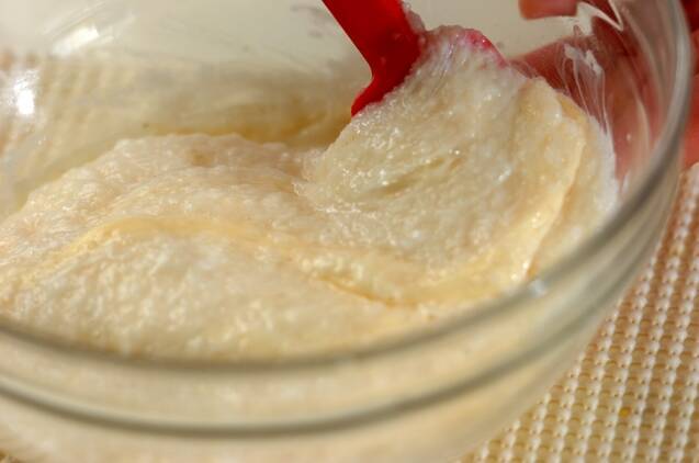 <グラタンソース>を作る。長芋は皮をむいてすりおろす。ボウルに長芋とマヨネーズ、塩コショウを加えて混ぜ合わせる。