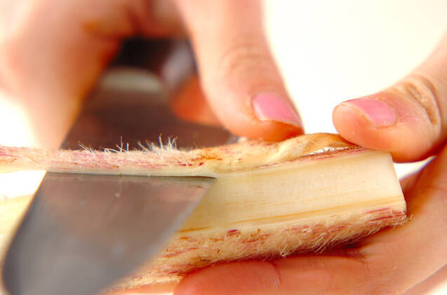 ウドは厚めに皮をむき、小さめの乱切りにして分量外の酢水にさらし、ザルに上げて水気をきる。菜の花は長さを3等分にする。