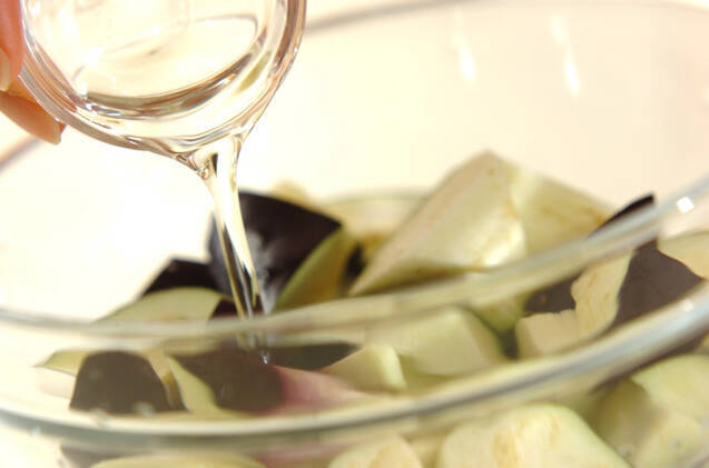 耐熱容器にぬれたままのナスを入れ、サラダ油をからめる。少しすき間をあけてラップをかけ電子レンジで2分加熱する。(ヒント)電子レンジは600Wを使用しています。