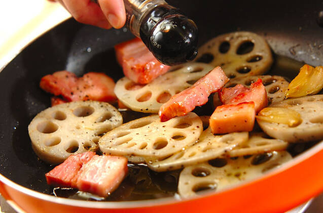 時々返しながら、レンコンに火が通るまで煮て塩、粗びき黒コショウを振る。