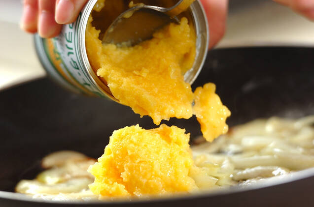 ペンネをゆでている間に、フライパンにバターを熱して玉ネギを炒め、しんなりしたらクリームコーンと<スープ>の材料を加え、煮たったらシメジを加えて2~3分煮る。