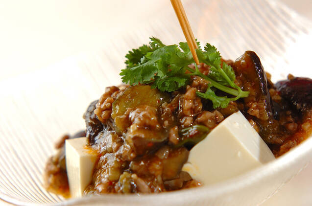 (5)にマーボーナス(2~2.5カップ)をかけ、香菜(刻み:適量)を添える。