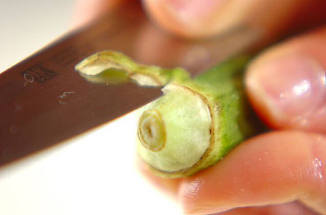オクラは分量外の塩少々で表面をこすり、水洗いする。ガクのまわりの固い部分を包丁で削ぎ取り、小さめの乱切りにする。