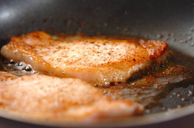 フライパンにバターを熱し、豚肉を両面強火で焼いたら弱火にして中まで火を通す。