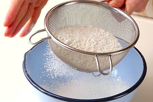 薄力粉、ベーキングパウダー、塩は合わせて網を通し、振るっておく。バター、ショートニングは常温に戻して柔らかくする。(急ぐ場合は各々耐熱ボウルにバターを入れ電子レンジで30~40秒加熱し柔らかく戻す)卵は割って軽くほぐしておく。
