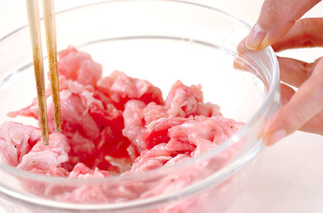 豚薄切り肉は、幅3cmに切り<豚肉の下味>をからめる。