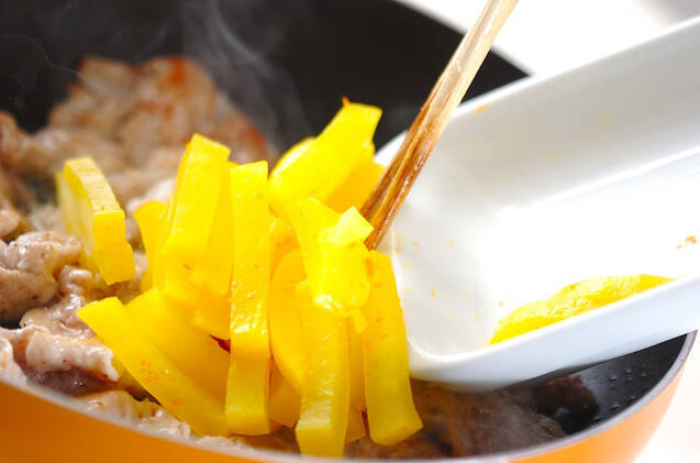 フライパンにゴマ油を熱して豚薄切り肉に焼き色がつくまで炒め、たくあんを加えて炒め合わせる。