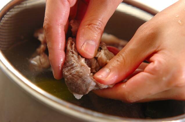 鍋に牛すじ肉、白ネギの青い部分、ショウガの半量を入れてかぶるくらいの水を加える。中火にして沸騰したら10分煮て、ザルに上げてアクと脂を洗い流す。ひとくち大に切る。