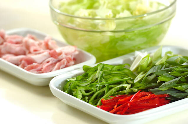 豚バラ肉は長さ3~4cmに切り、塩コショウをもみ込む。