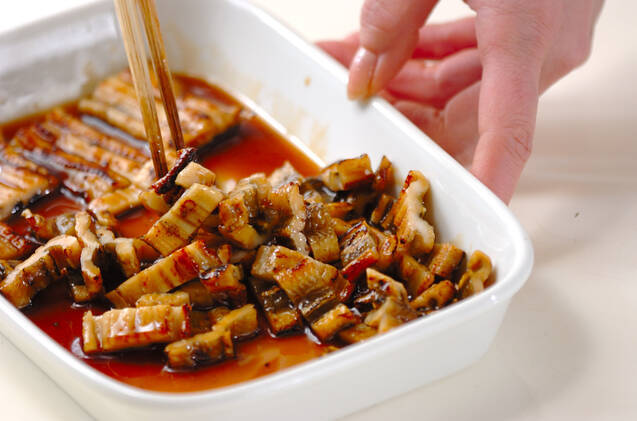 焼きアナゴは上にのせる飾り用を残して細かく刻み、蒲焼きのタレをからめておく。