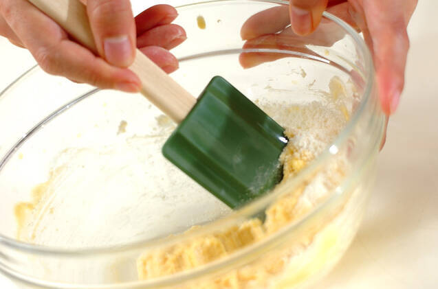 薄力粉、アーモンドプードルを合わせて、網で通して振るいながら2~3回に分けて振り入れ、こねないようにゴムベラなどでサックリ、粉っぽさがなくなる程度に混ぜる。ラップで包んで冷蔵庫で10分休ませる。