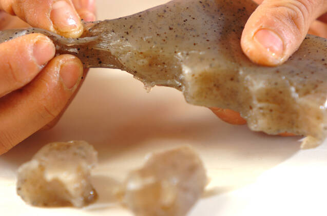 板コンニャクはひとくち大に手でちぎり、たっぷりの水と共に鍋に入れて強火にかけ、煮たったら30秒ゆでてザルに上げる。