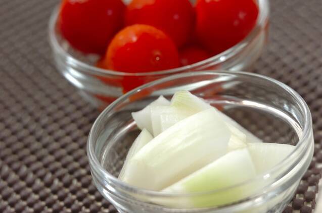 玉ネギは横2等分に切り、さらに幅1.5cmに切る。プチトマトはヘタを取る。