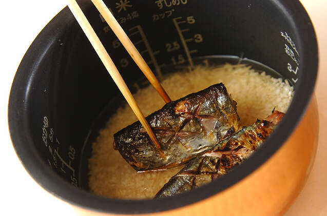 炊飯器に洗い米、<調味料>の材料を入れて分量線までの水、半量のショウガを加えひと混ぜする。昆布をのせ、さらに昆布の上に塩焼きのサンマをのせて普通に炊く。