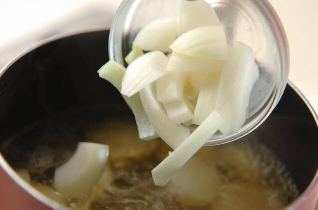 玉ネギを加えて1分煮、みそを溶き入れる。器に注ぎ、刻みネギを散らす。