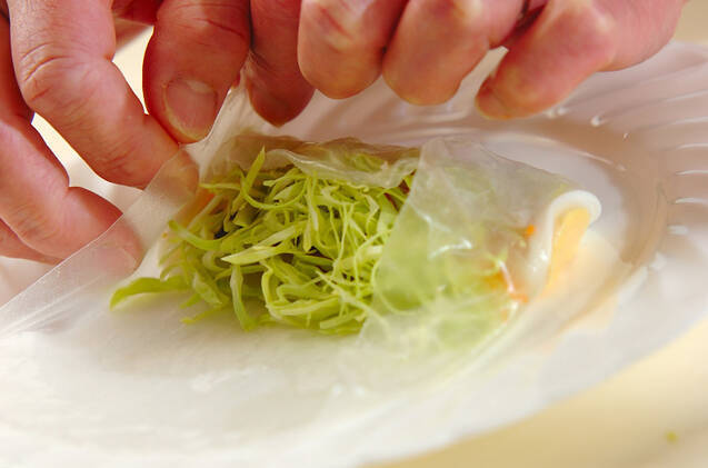 ライスペーパーの両面に軽く霧を吹きかけてお皿にのせ、春キャベツ、ニンジン、細ネギ、エビ、ゆで卵をのせて、しっかり巻く。