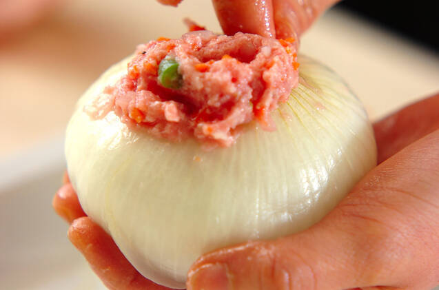 ボウルに<タネ>の材料、みじん切りにした新玉ネギを入れてよく混ぜ合わせ、2等分する。くり抜いた芯部分に<タネ>の2/3量を詰め、スライスチーズを詰めてさらに残りの<タネ>を詰める。