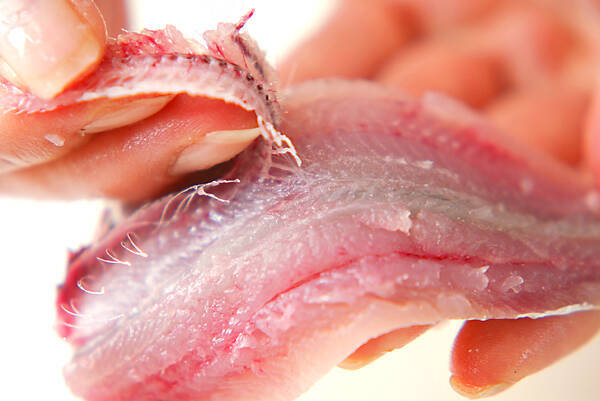 親指の腹で中骨に沿って尾の方に滑らせ1枚に開き、尾の付け根で骨を折り、左手で身を押さえながら中骨をはずし、腹骨を包丁ですき取り、海水ぐらいの塩水でサッと洗い、水気をふく。
