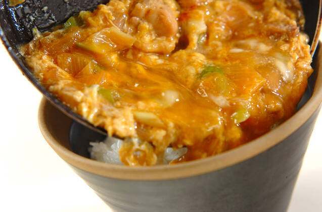 丼にご飯をよそって(3)をかけ、一味唐辛子を振ってお漬け物を添える。同様に繰り返す。