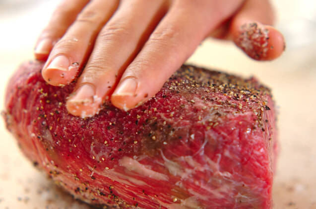 牛もも肉はキッチンペーパー等で表面を拭き、塩、粗びき黒コショウを手でしっかりすり込む。