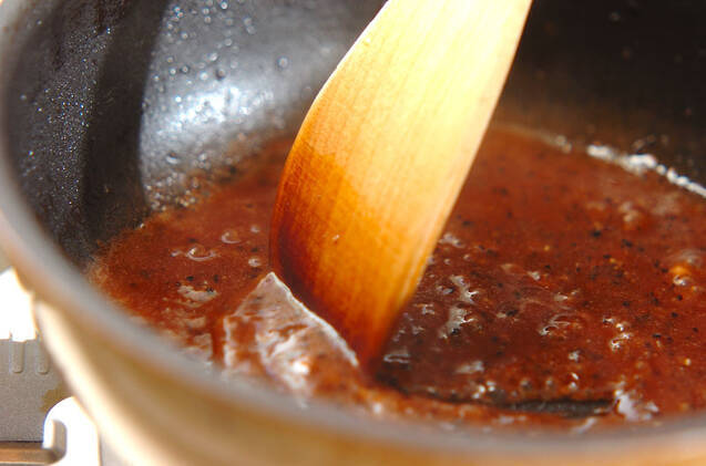 <ソース>を作る。(2)のフライパンに顆粒スープの素を加え、煮溶かして塩コショウで味を調え、小麦粉と混ぜ合わせたバターを加え、トロミがついたら火を止める。