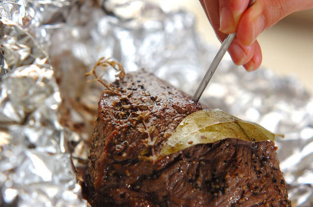 天板にのせ、160℃に予熱しておいたオーブンで30~40分焼く。途中 20分くらいで上下を返す。金串を牛もも肉の中央まで刺し、10~15秒おいて引き抜ぬいて唇にあて、温かいようなら出来ています。冷たいようならもう少し蒸し焼きにする。