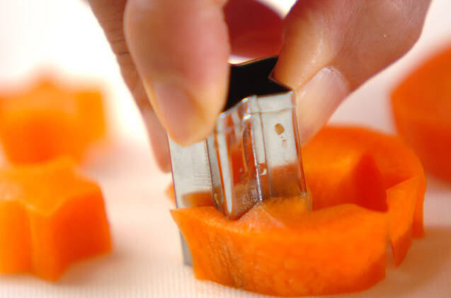 <つけ合わせグラッセ>のニンジンは皮をむいて星形に型抜きし、耐熱容器に重ならないように並べ、砂糖、塩を振ってバターをのせ、ラップをして電子レンジで1分加熱する。そのまま2分蒸らし、再び1分加熱する。竹串がスッと刺さったらOKです。