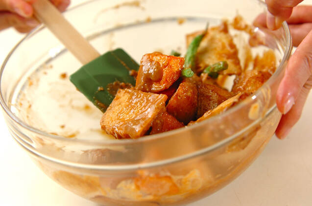 <ゴマみそダレ>のボウルに(1)を入れて和え、器に盛る。