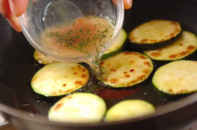 小さなフライパンにオリーブ油を熱し、ズッキーニを並べ入れる。途中で返しながら火を通し、<調味料>を加えて炒め合わせる。