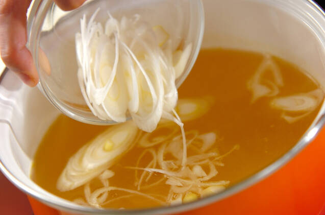 鍋に<合わせスープ>の材料を入れて中火にかけ、煮立ったら白ネギを加え2~3分煮る。
