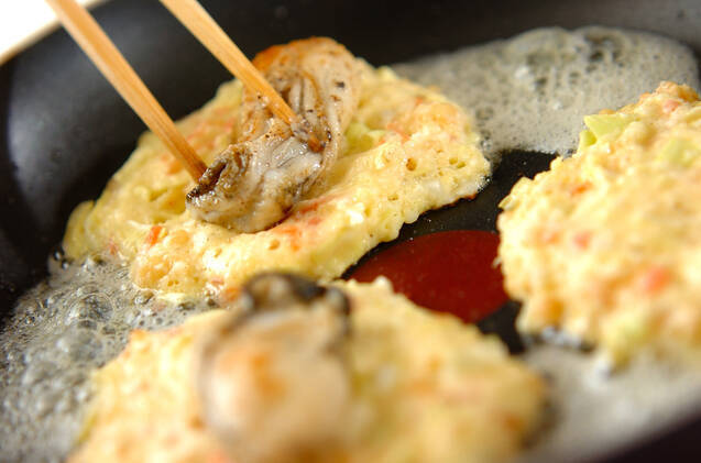 別のフライパンにサラダ油を薄く広げて中火にかけ、1の生地の1/6~1/8量を丸く入れ、周りが固まってきたらバター20gをフライパンの空いた所に入れ、2のカキをのせてひっくり返す。