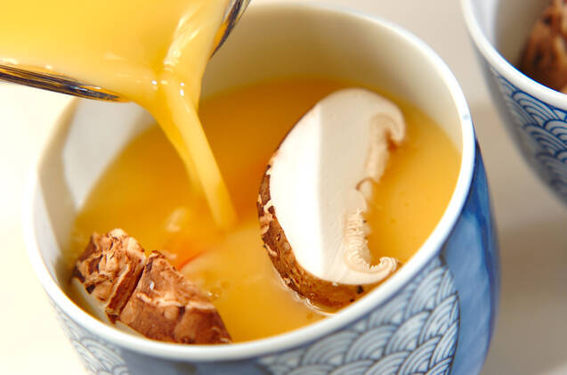 器に鶏もも肉、エビ、カマボコ、シイタケを入れ、<卵液>を静かに注ぐ。