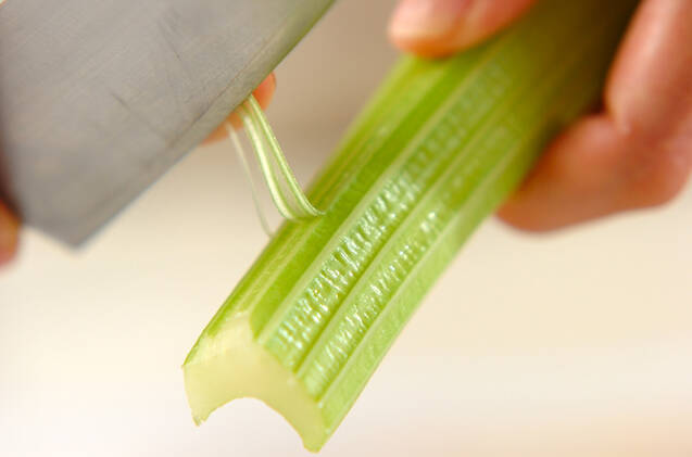 セロリは筋を引き、長さ4~5cm、幅1cm位に切る。