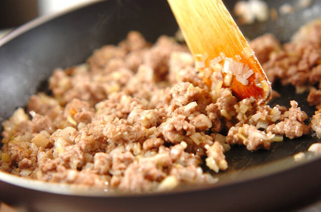 フライパンにサラダ油を熱し、白ネギとショウガを炒める。香りがたったら豚ひき肉を加え、ポロポロになるまで炒める。