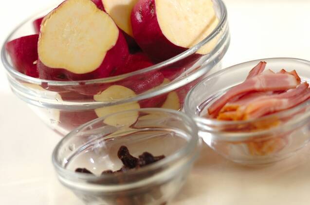 サツマイモは皮つきのままキレイに洗い、幅2cm程の輪切りにし、サッと水にさらして水気をきる。ベーコンは幅1cmに切る。レーズンはサッと水洗いする。