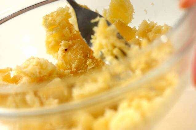 鍋にたっぷりの水とサツマイモを入れ、竹串がスッと刺さるまでゆでて、水気をきる。皮を取り除き、フォークまたはマッシャーで軽くつぶす。