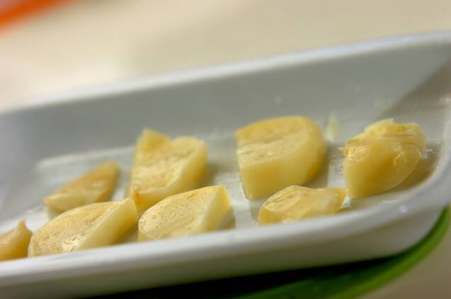 耐熱容器にジャガイモを入れてラップにかけ、電子レンジで5分加熱する。