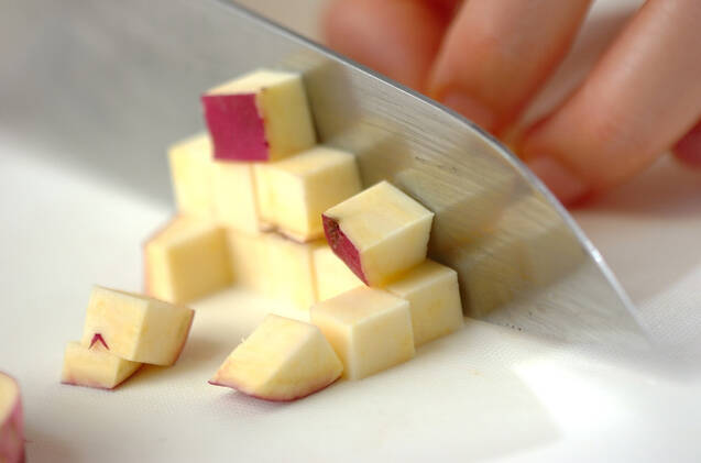 サツマイモは皮つきのまま1cm角に切り、水にさらす。