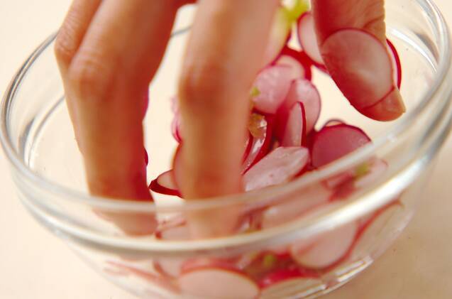 ラディッシュは葉を少し残して切り落とし、縦に薄い輪切りにする。塩をもみ込んで水気がでてきたらしっかり絞る。