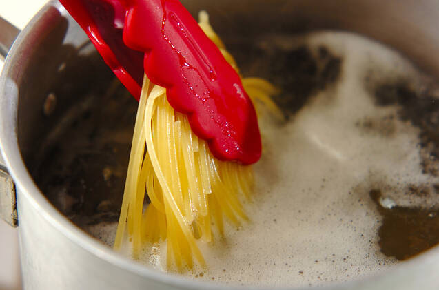 塩16gを入れたたっぷりの熱湯にスパゲティーを入れ、くっつかないように時々菜ばしで混ぜながら、指定時間より少し短い時間ゆでてザルに上げる。