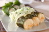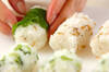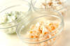 サケフレークにはおかずのりを、ちりめん山椒は大葉を巻いて器に盛る。