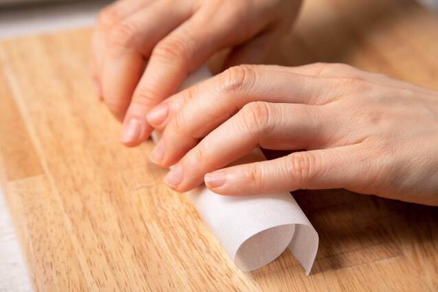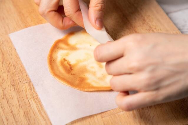 裏面にうっすら焼き色が付いたら15cm×15cm程に切ったオーブンペーパーの上に取り出し、ペーパーごと筒状に丸める。