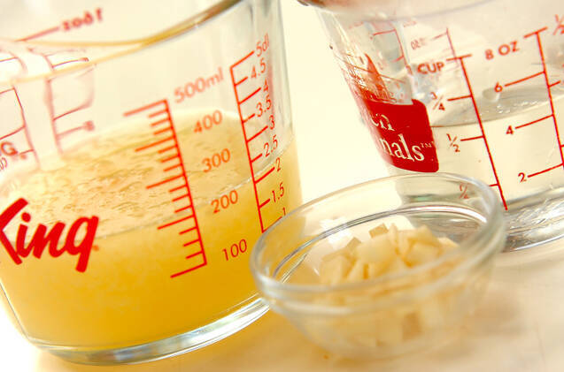 リンゴは皮をむき、縦3~4つのくし切りにする。1切れは芯を取り、5mm角に切る(さいの目切り)。残りは芯を取り、すりおろしてリンゴジュースと合わせる。