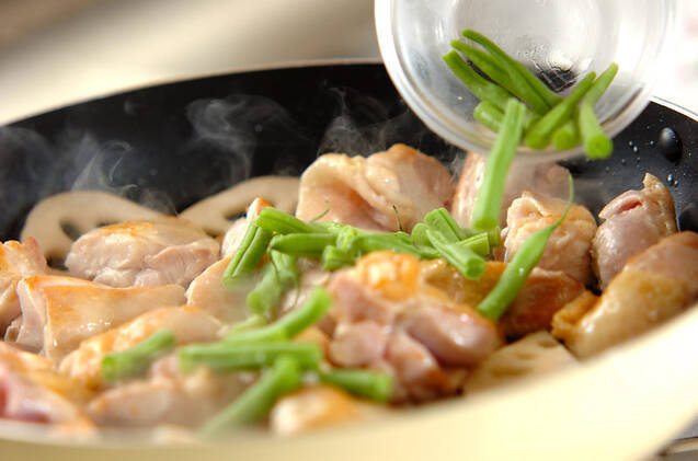 レンコン、サヤインゲンも加えて焼き、<調味料>の材料を加えて煮汁が少なくなるまで煮込む。器に盛り、すり白ゴマを振る。