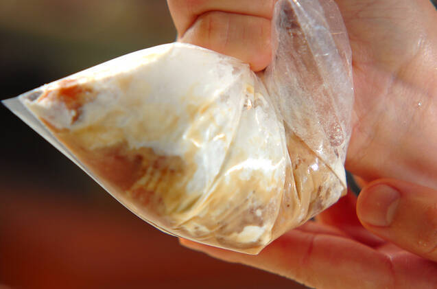 ビニール袋に(1)と小麦粉を入れ、全体にからめる。